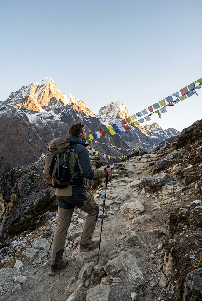Fotografia naturale senza testo di un escursionista su sentiero himalayano con bastoncini, in salita su terreno roccioso, bandiere di preghiera sullo sfondo e grandi vette innevate illuminate da luce mattutina